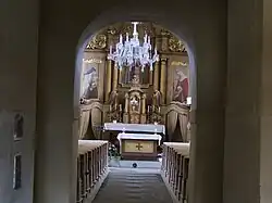 1936 wurde der Hochaltar aufgestellt: Das Hauptbild zeigt die Kirchenpatrone Petrus und Paulus, das linke Bild zeigt die hl. Theresia und das rechte Bild die heilige Elisabeth von Thüringen.
