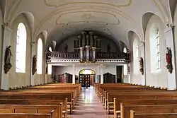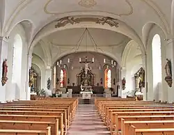 Das Querschiff ist mit zwei großen Rundbogenfenstern an den schlichten vierachsigen Saal der Barockzeit angefügt. Der kreuzgratgewölbte Chorraum ist von der Raumhöhe niedriger als das im Jahr 1927 gedrückt-tonnengewölbte Schiff und schließt dreiseitig ab.