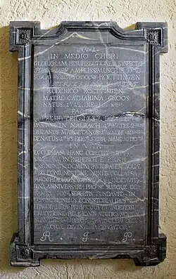 „Inmitten des Chores erwartet die glorreiche Auferstehung der hochwürdige und angesehene Herr Johann Wilhelm Jodokus Koettingen aus Wissen an der Sieg, Sohn von Roderich Koettingen und Katharina Groß, geboren am 16. Oktober 1712, zum Priester geweiht am 21. September 1737, Pastor in Nalbach am 24. Juni 1747, Dechant von Merzig am 10. April 1760, verstorben in der Frühe des 9. Februar 1783 im 70. Lebensjahr. In seinem Leben baute er diese Kirche wieder auf, ließ die Kapelle in Körprich aus Ruinen wieder erstehen, erweiterte das Pfarrhaus durch den Bau eines neuen Gebäudes, stellte in einer Pfarrei, die am Boden lag, die Rechtsordnung wieder her und stiftete für sich und seine hier beigesetzten Familienangehörigen zwei Jahresgedächtnisse. Er war in den Konsistorien und den bischöflichen Kommissionen kenntnisreich und unermüdlich. Durch seine Bildung, seinen Eifer für die Religion sowie durch seine liebenswürdige Umgangsweise und die Großzügigkeit seines Charakters war er eine Zierde des Klerus und verbreitete den göttlichen Ruhm. Er ruhe in Frieden.“