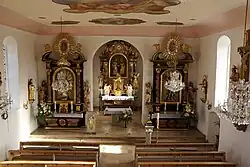 Der Innenraum des Langhauses ist mit einer Decke mit Hohlkehle überspannt, der des Chors, d. h. der des Erdgeschosses des Chorturms, mit einem Tonnengewölbe. Zur Kirchenausstattung gehört ein neobarocker Hochaltar, auf dessen Altarretabel Peter und Paul dargestellt sind. Die Orgel auf der Empore wurde 1999 von Mathis Orgelbau errichtet.[2]