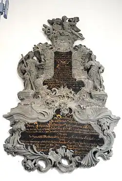Eine Gedenktafel aus dem Jahr 1959 erinnert an Fürst Rupert, der im Jahr 1944 an der Ostfront vermisst wurde. Den Gedenkstein stiftete sein Bruder Siegfried Fürst zu Castell-Rüdenhausen.[14]