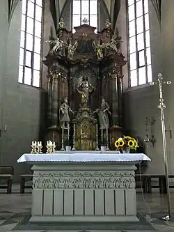 Die Kreuzrippengewölbe im Innern waren bis 1958 mit Rankornamenten verziert. In der Marienkapelle wurde diese Bemalung 1985 restauriert. Der barocke Hochaltar stammt noch aus der Vorgängerkirche. Er besitzt ein marmoriertes Säulenretabel. Im Zentrum befindet sich Jesus, ihm zur Seite gestellt die beiden Patrone Petrus und Paulus. Die Seitenaltäre sind Josef und Antonius von Padua gewidmet. Ebenfalls aus der alten Kirche wurden der spätbarocke Taufstein, eine Madonna aus dem späten 18. Jahrhundert und der Grabstein von Melchior von Talheim von 1580 übernommen.
