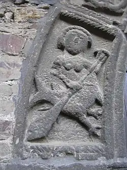In seiner ursprünglichen Bauform bietet sich dem Betrachter wohl allein der Torbogen mit seinen Steinreliefs dar, da dieser Bauteil wegen der besonderen Ausgestaltung seiner einzelnen Steine von Anfang an nur zu einem Bogen zusammengefügt werden konnte. Dieser Torbogen trägt zehn Steinreliefs, an deren Deutung sich Theologen und Kirchenhistoriker seit dem 19. Jahrhundert versuchten. Herrschende Interpretationslinie ist nach wie vor die These des Bonner Ordinarius’ Albert Michael Koeniger aus dem Jahr 1947, der in den Symbolen die Darstellung der Todsünden gemäß dem Beichtspiegel des Bischofs Burchard von Worms erkannt haben will. Nach dieser Lesart, die noch acht statt der heute geltenden sieben Todsünden kannte, bedeuten die Reliefs von links nach rechts: