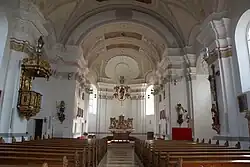 Bei der Restaurierung 1880/81 wurden die Altäre einschließlich des Hochaltars entfernt. Die Deckenmalereien wurden 1831 von Joseph Anton Merz geschaffen. In ihnen sind der heilige Paulus und der heilige Petrus dargestellt. Die Orgel wurde 2018 von der Arbeitsgemeinschaft des Orgelbauers Claudius Winterhalter und der Thomas Jann Orgelbau errichtet.[1]