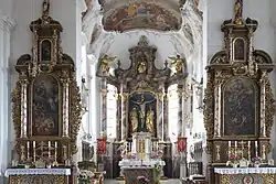Die hoch- und spätbarocke Altarausstattung ist besonders beachtenswert. Der Hochaltar ist eine geschwungene Sechs-Säulen-Architektur, die die Chorfenster miteinbezieht. Sein Schöpfer war 1756 Tassilo Zöpf. Der Auszug stammt vom Vorgängeraltar von 1693. Im Zentrum des Altars befindet sich die vollplastische Darstellung der Kreuzigung Jesu mit dem Erlöser am Kreuz und Maria und Johannes (19. Jahrhundert). Über dem stark verkröpftem Gebälk ist im volutengerahmten Auszug Gottvater mit Segensgestus und Weltkugel zu sehen. Eine Taube mit Strahlenglorie bekrönt den Altar. Auf den Gebälkstücken der äußeren Säulen sitzen hinweisende Engel.