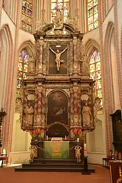 Hauptstück der Ausstattung ist ein hohes barockes Altarretabel, das 1710 von dem Meister Hans Hinrich Römers aus Hamburg geschaffen wurde. Der zweigeschossige Aufbau ist mit Gemälden, Figuren, Säulenrahmung und Akanthusornament ausgestattet. Über dem Abendmahlsgemälde in der Sockelzone ist das große Mittelbild mit der Geburt Christi und im Obergeschoss ein vollplastischer Kruzifix vor einer gemalter Landschaft angeordnet. Oberhalb des gebrochenen Segmentbogengiebels ist der Aufbau bekrönt vom Auferstandenen zwischen Engeln mit den Leidenswerkzeugen, seitlich neben den Säulen stehen Statuen der vier Evangelisten.