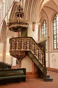 Die prachtvolle frühbarocke Kanzel von 1674 ist in kräftigen, betont plastischen Formen gestaltet und wird von der Halbfigur eines Atlanten getragen. Sie besitzt einen schalenförmigen, mit geflügelten Puttenköpfen verzierten Konsolboden und trägt an der Brüstung des Korbes und am Treppenaufgang Apostelstatuen zwischen gewundenen Säulen. Die Tür zum Kanzelaufgang ist durch ornamentierte Pilaster gerahmt, über dieser ist ein giebelartiger Aufsatz mit Knorpelwerk angeordnet. Der mehrstöckige, reich ausgestattete Schalldeckel ist mit Putten mit den Leidenswerkzeugen versehen und zeigt dazwischen unter einem von gedrehten Säulen gerahmtem Baldachin eine spätgotische Christusfigur vom Anfang des 16. Jahrhunderts. Als Bekrönung des Schalldeckels dient eine Statue von Christus mit der Siegesfahne von 1673/74.