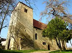 des Turmes sind als rundbogige Biforien ausgeführt, auf der Südseite des Kirchenschiffes ist ein vermauertes romanisches Portal zu erkennen. Die Fenster sind großteils spitzbogig.