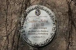 In die Mauer der Kirche ist ein Medaillon mit einem kleinen Bild der Sophie von Kühn eingelassen. Es trägt den Text: „Auf diesem Gottesacker ruht Sophie von Kühn, geb. 17. März 1782, gest. 19. März 1797 auf Schloss Grüningen. Sie war die Braut des Dichters Friedrich von Hardenberg.“ Die Gutsbesitzer fungierten jeweils ebenso als Kirchenpatron.[2]