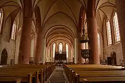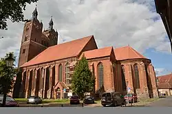 Die ursprünglich in Feldstein ausgeführte dreischiffige kreuzförmige Basilika des späten 12. Jahrhunderts wurde im frühen 13. Jahrhundert durch einen doppeltürmigen Westbau in Backsteinmauerwerk erweitert. Der Westbau zeigt in der Mittelachse ein prachtvolles rundbogiges Säulenportal, dessen Leibungen in Backstein und Haustein ausgeführt sind. Es ist in einer 1486 dem Westbau vorgesetzten Vorhalle verborgen.
