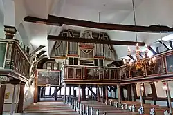 Der Innenraum ist durch drei Emporen auf der Nordseite, im Chor und im Querschiff gegliedert, die alle reich mit Emporenbildern verziert sind. Sie zeigen eine Vielzahl biblischer Szenen aus Neuem und Altem Testament. Zusammen mit den Bildern ehemaliger Pastoren bestimmen sie den Raumeindruck. Alle Gemälde in der Kirche und am Altar wurden von 1985 bis 1987 restauriert.
