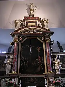 Der Altar von 1662 mit seinen Figuren im Stil der Spätrenaissance wird als Frühwerk dem Hamburger Bildhauer Christian Precht zugeschrieben. Er zeigt an den Seiten zwei große Statuen von Mose und Aaron, wird von Engeln und dem auferstandenen Christus bekrönt und besitzt ein großes Hauptbild sowie ein Bild in der Predella. Das Hauptbild zeigt eine Kreuzigungsszene, in der Predella ist das Abendmahl dargestellt. Beide Bilder werden in der Literatur entweder als Werke des deutsch-dänischen Malers Heinrich Dittmers[4][5] oder des Hamburger Malers Gert Dittmers[6] (möglicherweise ein Bruder Heinrich Dittmers[5]) angesehen.