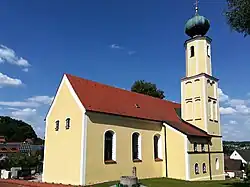 Die Saalkirche wurde im 18. Jahrhundert erbaut. Sie besteht aus dem 1886 nach Westen verlängerten Langhaus, dem dreiseitig geschlossenen Chor im Osten und dem Chorflankenturm auf quadratischem Grundriss an der Südwand des Chors, in dessen achteckigem Obergeschoss vier Glocken hängen. Den Abschluss des Turms bildet eine eingeschnürte Zwiebelhaube. Die Sakristei mit einem Oratorium im Obergeschoss steht in der Südwestecke von Turm und Langhaus. Langhaus und Chor sind mit Flachdecken überspannt.