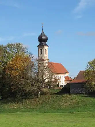 Der Saalbau mit leicht eingezogener Apsis, angefügter Sakristei und Zwiebelturm, ist das letzte Werk des Erdinger Baumeisters Anton Kogler. Die Fassade wird von Pilastern gegliedert. Eine Stichkappentonne über Pilastern deckt den Innenraum.