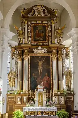 Im Jahr 1718 errichtete der aus Gemünden am Main stammende Bildhauer Anton Roth den viersäuligen Hochaltar der Kirche. Das 1730 vom Münnerstädter Lehrer Peter Herrleins geschaffene Altarblatt zeigt die Kreuzigung Christi. Die Heiligen Petrus und Paulus, die ehemaligen Namenspatrone der Kirche, sind als Steinfiguren neben dem Altarblatt dargestellt. Der Altarraum wurde im Jahr 1968 den Vorgaben des Zweiten Vatikanischen Konzils angepasst.