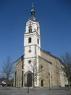 Der Vorgängerbau der heutigen Pfarrkirche war ein spätgotischer Bau. Die Angaben zum Entstehungsdatum sind widersprüchlich. So gibt die Oberamtsbeschreibung von 1845 das Jahr 1484 an[2]. In Württembergs Kirchliche Kunstalterthümer wird auf das Jahr 1434 verwiesen.[3] Der Abriss erfolgte 1850.