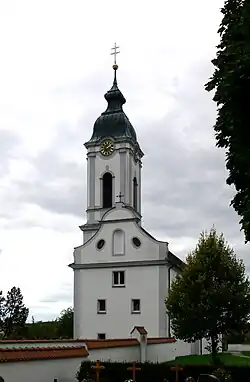 Die Saalkirche wurde 1758–70 nach einem Entwurf von Jakob Emele erbaut. Sie besteht aus einem Langhaus, einem eingezogenen, längsrechteckigen Chor im Osten und einem Kirchturm vor der Südwand des Langhauses, der mit einer Welschen Haube bedeckt ist. Sein oberstes Geschoss beherbergt die Turmuhr und den Glockenstuhl. Die Fassade im Westen, in der sich das Portal befindet, ist mit einem Volutengiebel bedeckt, in dem sich in einer Nische die Statue des Remigius befindet.