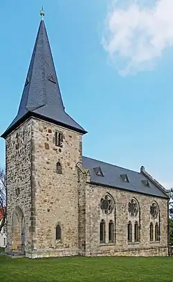 Die Kirche ist ein unverputzter Bau aus Unstrutsandstein. Ihre Länge über alles beträgt etwa 25 Meter, wovon circa sieben Meter auf den Turm entfallen. Ihre Längsachse weicht um 27° nach Norden von der Ostung ab.[5] Der westseitige Turm mit Untergeschoss und vier Etagen besitzt einen quadratischen Grundriss. Der quadratische Dachansatz geht in eine hohe achteckige Turmspitze mit Turmkugel über. An seiner Westseite befindet sich die Hauptpforte der Kirche.