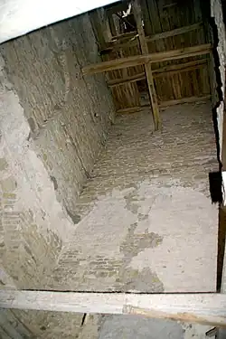 Damals wurden zudem aus statischen Gründen an beiden (West-)Ecken des Turms Strebpfeiler angebracht.[19] Die heutigen Schallöffnungen (je zwei an der Ost- und West- sowie je eine an Nord- und Südseite) liegen seither über diesem ehemaligen Glockengeschoss und werden von einem geknickten schiefergedeckten Zeltdach abgeschlossen, das durch mehrere Stürme seit 2015 inzwischen eingestürzt ist.
