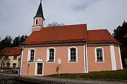 Die barocke Saalkirche wurde 1687–90 erbaut. Sie besteht aus einem Langhaus und einem eingezogenen, dreiseitig geschlossenen Chor im Osten. Über dem Giebel im Westen des Satteldaches des Langhauses erhebt sich ein quadratischer Dachreiter, dessen oberes, achteckiges Geschoss den Glockenstuhl beherbergt, und der mit einem Knickhelm bedeckt ist.