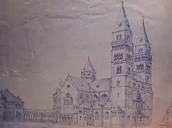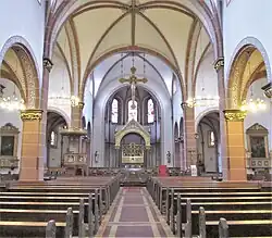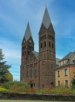 Das Kirchengebäude wurde von Architekt Wilhelm Hector im neuromanischen Stil errichtet, der sich die Abteikirche Maria Laach in der Eifel zum Vorbild nahm. Erbaut wurde eine dreischiffige Pfeilerbasilika, unterteilt in drei Joche mit einem das Langhaus nur wenig überragenden Querschiff. Vierung und Gewölbefelder des Mittelschiffes sind quadratisch angelegt, wobei ein Feld des Mittelschiffes zwei Jochen der Seitenschiffe entspricht. Die Pfeiler sind nach dem „Echternacher System“ gebaut, was bedeutet, dass die größeren Bögen, die von Pfeiler zu Pfeiler gespannt sind, nochmals durch kleinere Doppelbögen unterteilt sind, die auf Säulen ruhen. Der Chor im Osten ist in drei Abschnitte unterteilt, die jeweils in Apsiden enden. Im Westen besitzt das Kirchengebäude eine Doppelturmfassade.[4]