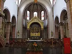 Bemerkenswert im Inneren der Kirche ist der ehedem als Hochaltar fungierende neoromanische Baldachinaltar, der von den Bildhauern Karl Frank (Trier) und Wilhelm Dreiser (Bitburg) geschaffen wurde. Er ist einer der wenigen Baldachinaltäre dieser Stilrichtung im Bistum Trier, und bis auf Einzelheiten eine fast genaue Nachbildung (allerdings ohne Kuppel) des 1897 von Kaiser Wilhelm II. gestifteten Baldachins über dem Sakramentsaltar in der Abteikirche Maria Laach.[4]