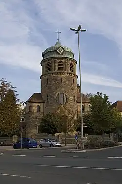 Der mit bräunlichem Sandstein aus Otterberg errichtete Kirchenbau wird von dem wuchtigen Rundturm auf der Westseite beherrscht. Der Turm erhebt sich zwischen zwei Annexen, von welchen einer als Taufkapelle und der andere als Treppenhaus zur Empore genutzt wird. Unter dem flachen, abgewalmten Turmhelm befindet sich der Glockenstuhl, welcher an den acht rundbogigen Schallarkaden zu erkennen ist. Vor dem Turm befindet sich eine kleine, überdachte Eingangshalle, deren Dachgiebel auf jeder Seite von einem Säulenpaar getragen wird. Im Giebelfeld über der Archivolte des Eingangs befindet sich ein Steinrelief mit der Darstellung des Lammes Gottes. Im linken Annex befindet sich ein Seiteneingang, welcher ins Stiegenhaus zur Empore führt. Der Schriftzug auf dem Türsturz lautet „venite adoremus“, was zu deutsch „Kommt, lasst uns anbeten“ heißt. Vor dem rechten Annex (Taufkapelle) steht ein steinernes Kreuz. Das dreischiffige Langhaus hat einen basilikalen Aufbau. In den Seitenschiffen sind Rundbogenfenster, im Obergaden Rundfenster.