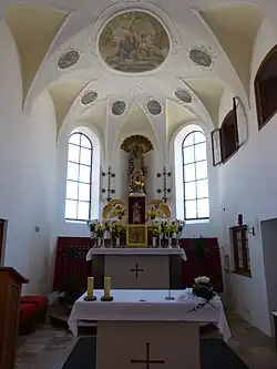 In den Jahren 1922/23 wurde im Zuge einer umfangreichen Renovierung unter Leitung des Augsburger Architekten Karl Kurz der Altar von 1886 entfernt und die Nische im Chorscheitel freigelegt. In dieser Nische wurde eine von Carl Bauer aus München geschaffene Terrakottafigur des heiligen Sebastian aufgestellt. Neue Deckenbilder mit expressionistischen Anklängen von Josef Bergmann aus München stammen ebenfalls aus dieser Zeit.