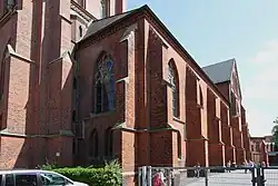 Das Gebäude ist eine dreischiffige Hallenkirche aus Backstein in neogotischem Stil nach einem Entwurf von Heinrich Beumer. Es ist 46 Meter lang und 22 Meter breit. Der Innenraum ist 14,50 Meter hoch, der Turm 32 Meter. Dieser trug bis zu seiner Zerstörung 1943 einen 21 Meter hohen Helm, so dass seine ursprüngliche Höhe 53 Meter betrug.[2]