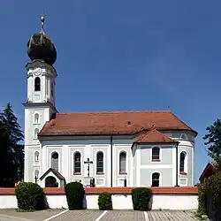 Die barocke Saalkirche wurde 1758 nach einem Entwurf von Johann Baptist Lethner errichtet. Sie besteht aus dem Langhaus zu vier Jochen, dem eingezogenen, halbrund geschlossenen Chor im Osten, der Sakristei an der Südwand des Chors, in deren Obergeschoss ein Oratorium liegt, einem Vorbau an der Südwand des Langhauses und dem Kirchturm im Westen.