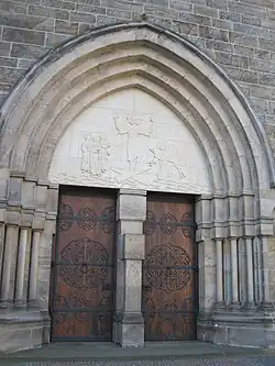 Da die Kirchentüren aufgrund der denkmalschutzrechtlichen Bestimmungen nicht erneuert werden durften, wurden sie im Jahre 2002 restauriert. Dazu wurden die Türblätter aus Eichenkernholz sandgestrahlt und abgebeizt. Nach dem Verfugen der Risse und Fugen strich man die Türen mit einer Holzschutzlasur. Besonderes Augenmerk wurde auf die Ornamente gelegt, die von Pfarrer Werges so gedeutet wurden: Sie zeigt ein Kreuz und die Früchte von Eiche und Paradiesbaum. Die Symbole weisen den Betrachter auf die Treue Gottes und die Erlösung durch Jesus Christus hin. Jeder, der durch die Tür eintritt, kann in der Mitfeier des Gottesdienstes einen Abglanz des Paradieses verspüren. Um die Ornamente wieder zur Geltung zu bringen, wurde sie gereinigt und von Korrosionsschäden befreit.