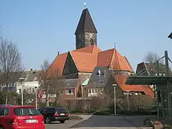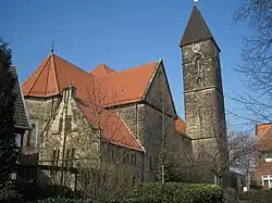 Am 24. Juli 1906 erfolgte die Grundsteinlegung. Am 6. Oktober 1907[9] (alternative Angabe: 6. November 1907[10]) wurde die neu erbaute Pfarrkirche durch Bischof Hermann Jakob Dingelstad eingeweiht. Sie entspricht einem Stil, der damals in Norddeutschland und Berlin üblich war. Um die Jahrhundertwende aus den Formen der Neoromantik entwickelt, im Detail vielfach mit Elementen des Jugendstils und der wilhelminischen Renaissance durchsetzt. Mit ihrem wuchtigen Turm bildet sie das Wahrzeichen des ehemaligen Dorfes, das, wie die Höveler Kirche, weit in das Münsterland und in die Gegend am Hellweg schaut.