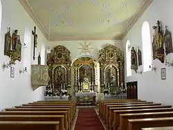 Der Putz der Chorturmkirche mit Steildach über dem fünfachsigen Langhaus ist neuromanisch gegliedert. Den quadratischen Chorturm krönt ein oktogonaler Aufbau mit Zwiebelhaube.[3] An der Nordwand ist eine frühere Eingangstür noch zu erkennen.[1] An der nördlich an den Turm angebauten Sakristei befindet sich nördlich eine gotische Ecknische, ein Pendant zum einfacheren Sakramentshäuschen im Chor.[4]