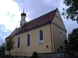 Das Langhaus wurde 1709 an eine 1671 errichtete Kapelle nach Westen angebaut. Die Kapelle wurde zum jetzt eingezogenen, dreiseitig geschlossenen Chor umgestaltet. Aus dem Dach des Chors erhebt sich ein quadratischer Dachreiter, der mit einem achteckigen Geschoss aufgestockt und mit einer Zwiebelhaube bedeckt wurde.