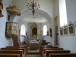 Die im Kern spätgotische, östlich mit dem Schloss Herrnfehlburg verbundene ehemalige Schlosskirche wurde im Barock umgebaut. Die Saalkirche besteht aus dem Langhaus, dem dreiseitig geschlossenen Chor im Osten und einer Sakristei an der Südwand des Chors mit einem Oratorium im Obergeschoss. Auf dem mit Schindeln verkleideten Satteldach des Langhauses erhebt sich ein quadratischer Dachreiter mit achteckigem Obergeschoss, Turmuhr im unteren Teil und abschließendem Spitzhelm. Die Innenräume sind mit Flachdecken überspannt. Der Hochaltar wurde um 1740 aufgestellt. Eine Muttergottesfigur an der Nordwand stammt aus der Zeit um 1500.