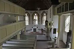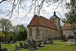 Die heutige Saalkirche wurde 1734 bis 1739 errichtet. Sie ist im Kern jedoch älter und wurde auch später mehrfach umgebaut. Der Chor hat einen dreiseitigen Abschluss und fluchtet im Norden mit dem Kirchenschiff, im Süden ist er dagegen eingezogen. Der Kirchturm steht im Westen. Die Portale im Westen und Süden haben Zahnschnitt und Kymatien und als Bezeichnung die Jahreszahl 1555. Der Innenraum wurde 1855 mit einem hölzernen Tonnengewölbe überspannt, das in Kassetten unterteilt ist, die mit barocken Malereien in ovalen Medaillons und Stuck versehen sind. Der Chor ist mit Ornamenten bemalt. An den Brüstungen der Emporen sind Reste alt- und neutestamentlicher Malerei aus dem 18. Jahrhundert vorhanden, sie wurden teilweise überarbeitet. Die Wandmalerei im Chor stammt aus dem 16./17. Jahrhundert. Die Gewände der Fenster haben als Ornamente Putten und Tugenden, an der Südwand zeigen sie die Auferstehung Jesu Christi. Die Kanzel hat ein Relief mit Figuren von Jesus Christus und den Evangelisten. Das Taufbecken ist aus dem 17., das Kruzifix aus dem 18. Jahrhundert. Im Chor befinden sich Epitaphien zweier Geistlicher in Amtstracht von 1501 und 1510.