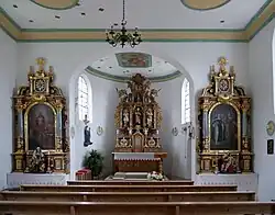 Der Vater von Johann Sebastian Degler baute 1676 den barocken Hochaltar. In der zentralen Nische des Altarretabels steht eine Statue des heiligen Ulrich von Augsburg, links und rechts daneben, jeweils zwischen zwei Säulen, die Skulpturen der heiligen Afra von Augsburg und der heiligen Barbara von Nikomedien. Der Altarauszug enthält eine sitzende Figur der Himmelskönigin mit dem Jesuskind auf dem Schoß und einem Zepter in der rechten Hand. Die Seitenaltäre entstanden wahrscheinlich in der Zeit 1675. Auf dem linken Altar ist der auferstandene Christus mit Maria und dem hl. Michael dargestellt. Der rechte Altar zeigt die hl. Mechthildis und die hl. Agatha. Auf den Altartischen stehen links eine Anna Selbdritt (Mutter Anna mit ihrer Tochter Maria und dem Jesuskind) und rechts eine Pietà. Diese Figuren entstanden im frühen 18. Jahrhundert.[1] Eine um 1700 entstandene Skulptur des Josef von Nazaret wird Lorenz Luidl zugeschrieben.