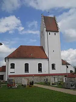 Die einschiffige Kirche mit westlichem Vorzeichen wurde 1739/40 im Barockstil unter Weiterverwendung des mittelalterlichen Turmes errichtet; die Einweihung erfolgte am 20. Juni 1752.[3] Der ungegliederte Turm mit Staffelgiebel und Satteldach steht im Osten der Kirche und birgt im Untergeschoss den quadratischen Chor. Östlich des Chores befindet sich ein Sakristeianbau. Das rechteckige Langhaus mit drei Fensterachsen hat die Maße 9 × 15 Meter;[4] seine Ecken sind nach innen abgerundet. Im westlichen Teil des Langhauses befindet sich die Orgelempore.