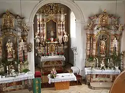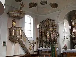 Auch die Altäre mit ihren Schreinfiguren und die Kanzel sind barock. Der Hochaltar hat sechs Säulen; die Seitenaltäre mit je vier Säulen sind in ihrer Bauweise den abgerundeten Langhausecken angepasst. Das Hochaltarbild zeigt den Kirchenpatron mit Ulrichskreuz; die flankierenden Statuen stellen den hl. Franz Xaver (rechts) und den hl. Johannes Nepomuk (links) dar. Im Auszug, der von zwei Engeln flankiert wird, ist das Christusmonogramm „IHS“, umgeben von sieben Putten und von hinten beleuchtet von einem Buntglasfenster. Über dem Tabernakel nährt ein Pelikan seine Jungen – ein Symbol für die Eucharistie; rechts und links vom Tabernakel kniet je ein kerzenhaltender Engel. Die Seitenaltäre haben je vier Säulen; im rechten Altar steht eine Figur des hl. Sebastian, im linken eine gekrönte Madonna mit dem Jesuskind.