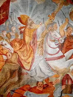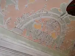 Chor und Langhaus der Kirche sind barock stuckiert mit Bandwerk und Blumenkörben.[3] Die Decke des Langhauses weist zwei große sowie 16 kleinere medaillonförmige Fresken von 1749 auf. Sie wurden von Johann Dominikus Murmann unter Verwendung von Kupferstichvorlagen Johann Georg Bergmüllers gemalt. Spätere „verunstaltende Ausbesserungen“[10] wurden bei einer Innenrenovierung 1988/89 rückgängig gemacht. Die Deckenfresken zeigen die Aufnahme Mariens in den Himmel und den Kirchenpatron bei der Schlacht auf dem Lechfeld im Jahr 955. Die Medaillons stellen die Zwölf Apostel und die vier Kirchenväter Gregor, Hieronymus, Ambrosius und Augustinus dar.[4]