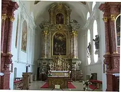 1487 ist ein Marienaltar dokumentiert, 1593 waren drei Altäre vorhanden. Vom barocken Hochaltar blieb beim Brand 1893 nur der in reichem Goldschmuck strahlende Tabernakel von Johann Richard Eberhard, geschaffen 1769/70, übrig. Die beiden Seitenaltäre konnten gerettet werden.