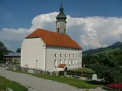 Am 16. April 1893 brannte die einst barocke Pfarrkirche aus. Erhalten geblieben sind unter anderem der untere Teil der Kanzel mit den vier goldenen Evangelistensymbolen am Kanzelkorb (Johann Georg Hagenauer, um 1700). Der Wiederaufbau nach Plänen von Hugo von Höfl erfolgte 1894/95. Die Deckenfresken schuf 1895 Bonifaz Locher aus München. 1979 wurde die Kirche um die Emporentiefe verlängert und restauriert.
