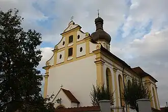 Die Außenfassade ist durch Pilaster mit toskanischen Kapitellen und große Rundbogenfenster gegliedert. Die Westfassade besitzt einen mit Lisenen und Blendfelder gestalteten Stufengiebel, dessen Ecken in Voluten auslaufen.
