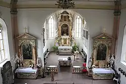Die spätgotische Saalkirche auf einem künstlich aufgeschütteten Plateau besteht aus einem Langhaus, einem eingezogenen, dreiseitig geschlossenen, von Strebepfeilern gestützten Chor im Osten und einem Fassadenturm im Westen. Der Turm ist mit einer Glockenhaube bedeckt. Die Sakristei befindet sich unter dem Schleppdach an der Nordseite des Chors. Der Innenraum des Chors ist mit einem Sterngewölbe überspannt. Zur Kirchenausstattung gehören der Hochaltar und die Kanzel aus dem 18. Jahrhundert.