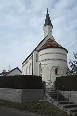 Die Kirche ist ein bescheidener Saalbau mit eingezogener, halbrund geschlossener Apsis. Über dem Ostgiebel erhebt sich ein polygonaler Dachreiter, der mit einem Spitzhelm gedeckt ist. Die Ostseite des Langhauses weist auf beiden Seiten zwei schmale, hohe Rundbogenblenden auf. Die ungewöhnlich hohe, von einer Halbkuppel gedeckte Apsis reicht bis zum Giebelansatz des Langhauses. An der Südseite des Langhauses öffnet sich ein schmuckloses, rundbogiges Stufenportal zum Innenraum. Die großen Rundbogenfenster im Langhaus und im Chor wurden in der Zeit des Barock durchgebrochen.