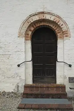 Über dem Portal ist in der gesamten Länge des Langhauses ein rechteckiges Blendfeld eingeschnitten, das oben von einem Rundbogenfries und darunter von einem, durch kleine Lichtschlitze unterbrochenen Deutschen Band gerahmt wird. Die Bögen der Blendarkaden ruhen auf gestuften Konsolen, die Bogenfelder sind mit ornamentalen und figürlichen Rotmalereien verziert, die bei der Restaurierung in den Jahren 1973 bis 1976 wieder freigelegt und teilweise ergänzt wurden. Auf den Malereien sind Schachbrettmuster, ein Rad, ein Kreuz und andere Leidenswerkzeuge, Löwen und Tiersymbole zu erkennen.
