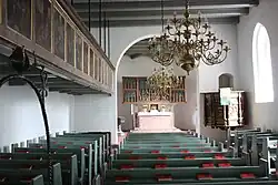 - Wichtigstes Stück der Ausstattung ist der dreiflügelige geschnitzte Altar aus der Zeit um 1480 im spätgotischen Stil. Die ursprüngliche mittelalterliche Fassung ging im Laufe der Zeit verloren. Die Kreuzigungsszene ist in realistischer Art ausgeführt. Die Kreuzigung und der Streit um den Rock Christi sind figurenreich und anschaulich dargestellt. Die beiden Seitenflügel zeigen Bischöfe, Heilige und Apostel. Ein ursprünglich in der Predella aufgestelltes Relief der Anna selbdritt, mit Anna und Maria mit dem Jesukind und den jeweiligen Ehemännern Joachim und Josef dahinter, wurde 1686 durch ein barockes Gemälde des Abendmahls ersetzt. Rechts und links davon stehen die Einsetzungsworte, wie sie bei der Abendmahlsfeier gesprochen werden.[3]