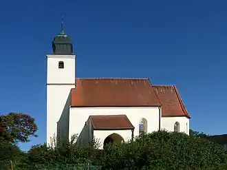 Die gotische Saalkirche besteht aus dem am Ende des 15. Jahrhunderts gebauten Langhaus zu drei Jochen, dem eingezogenen, dreiseitig geschlossenen, spätgotischen Chor zu einem Joch mit Fünfachtelschluss im Osten, einer Sakristei an der Nordwand des Chors und dem Fassadenturm mit Zwiebelhaube im Westen. Ein offener Vorbau an der Südwand des Langhauses führt zum Portal.