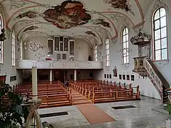 Der mit Rocaillen verzierte Innenraum des Langhauses ist mit einem Stichkappengewölbe überspannt. Zur Kirchenausstattung gehören ein Hochaltar, eine Kanzel und zwei Votivbilder.