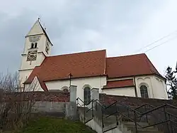 Der älteste Teil der Kirche, der Chor und das Langhaus, gehen auf das Jahr 1460/70 zurück. Am Turmgiebel war ursprünglich die Inschrift 1570 angebracht. Diese bezog sich vermutlich nur auf den Turmneubau. Im Jahr 1730 fand eine Umgestaltung des Innenraumes statt. Aus dieser Zeit stammt auch der Anbau der Vorhalle auf der Südseite. Die Kirche wurde auf einem steilen Burgstallhügel westlich des Ortes errichtet.[2]